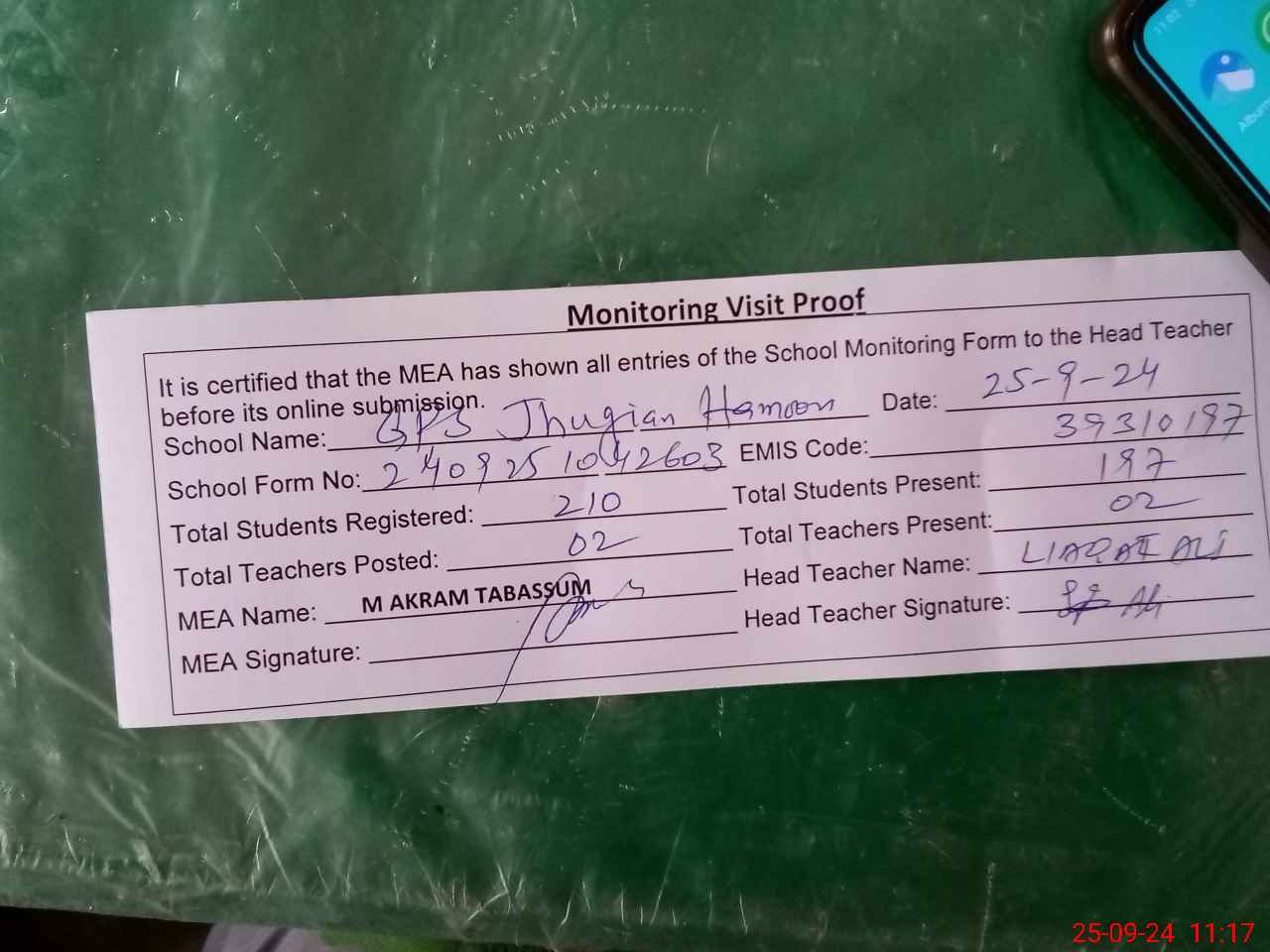 | Certified that this School was Inspected by the Undersigned MEA/DMO Today and the Information Stated Above is as Per Record. | |||||