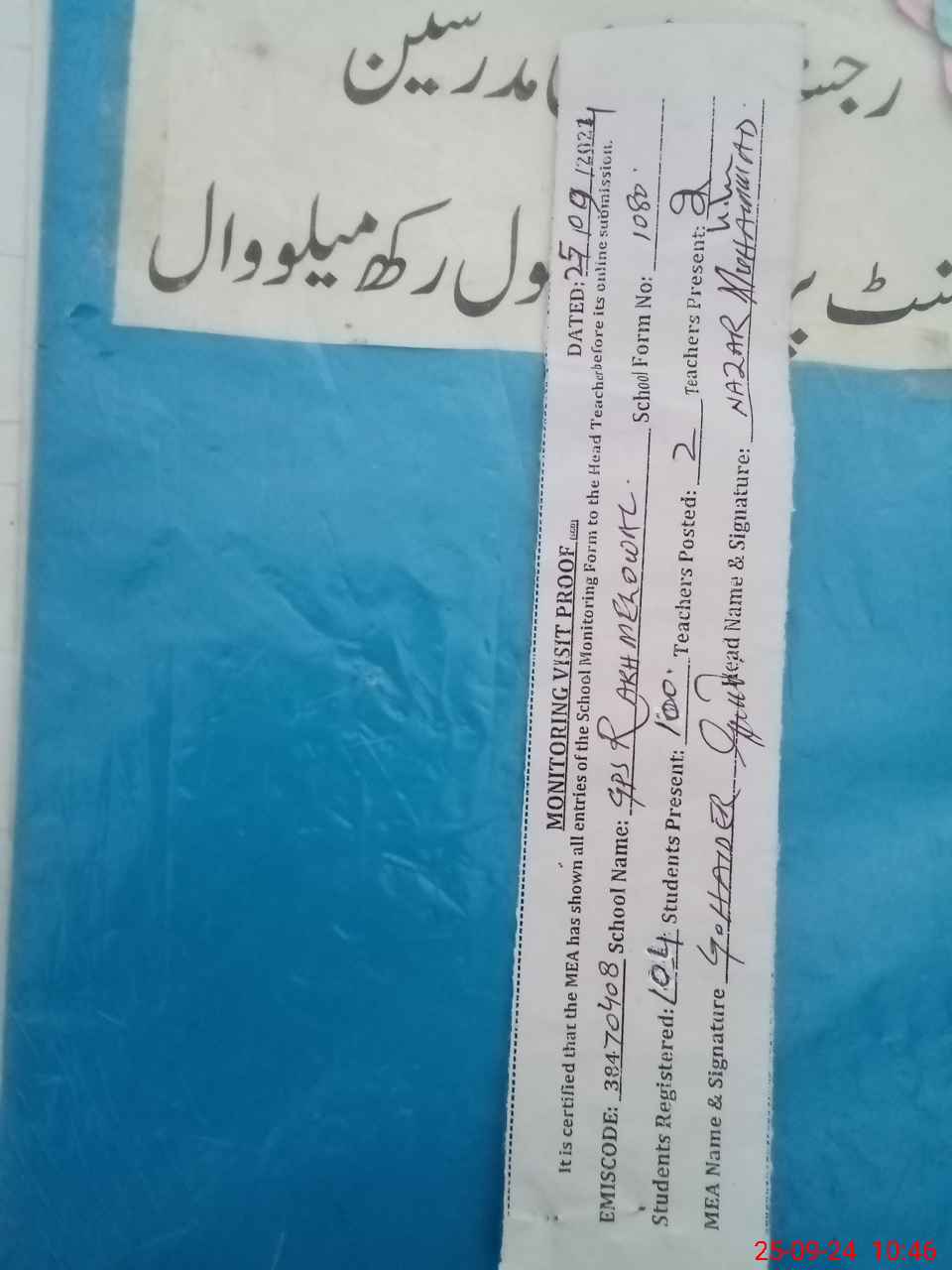 | Certified that this School was Inspected by the Undersigned MEA/DMO Today and the Information Stated Above is as Per Record. | |||||
