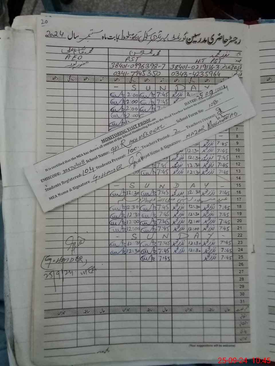 | Monitoring Date: 25-09-2024 | Start Time: 25-09-2024 10:20 AM | End Time: 25-09-2024 10:47 AM | Name of MEA: GH**** HA**** | |