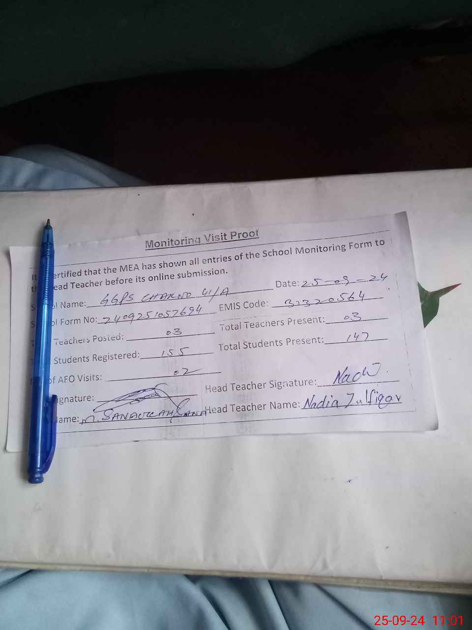 | Name: NA**** ZU**** Designation: (School Headmaster's/Headmistress's) PST Phone/Cell Number: 03**** |