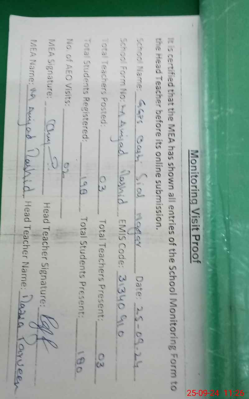 | Certified that this School was Inspected by the Undersigned MEA/DMO Today and the Information Stated Above is as Per Record. | |||||