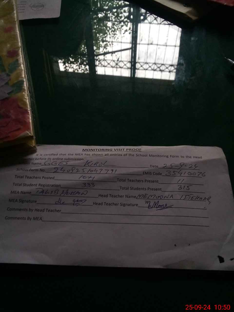 | Attendance Register | Head Teacher | MEA with School | Visit Proof |