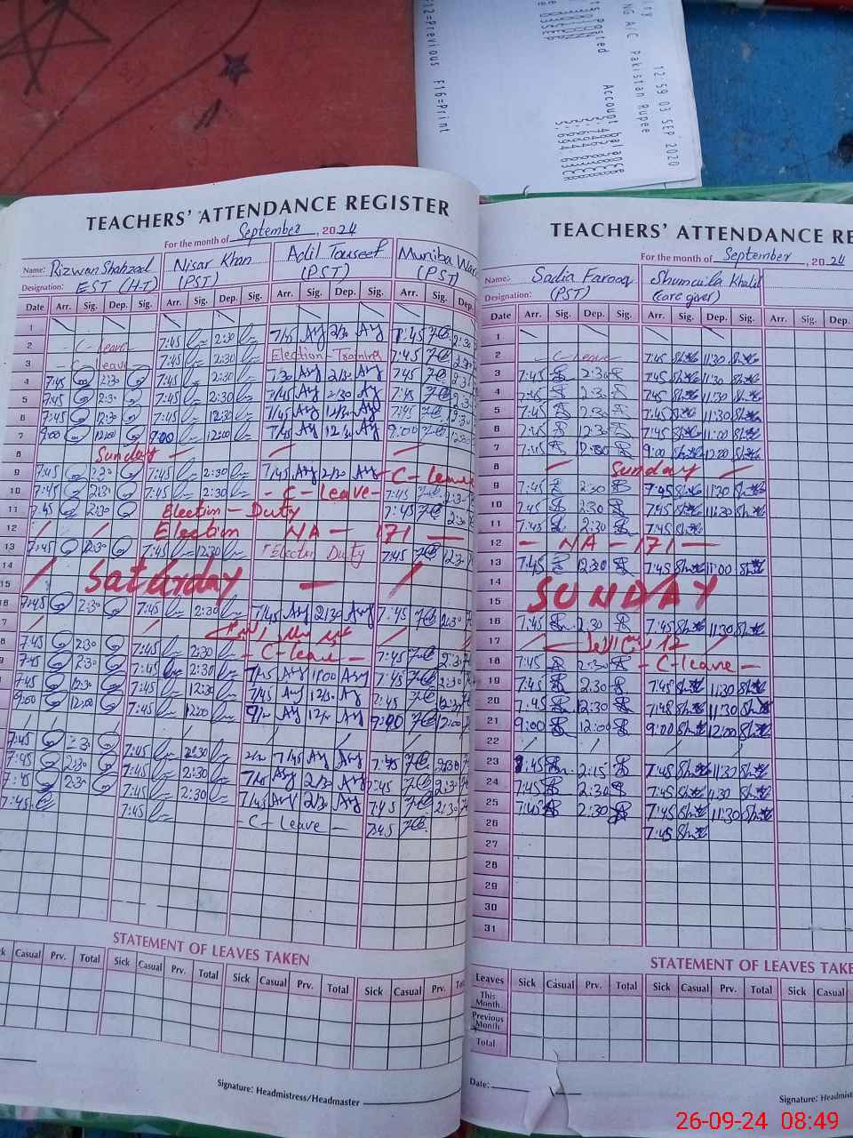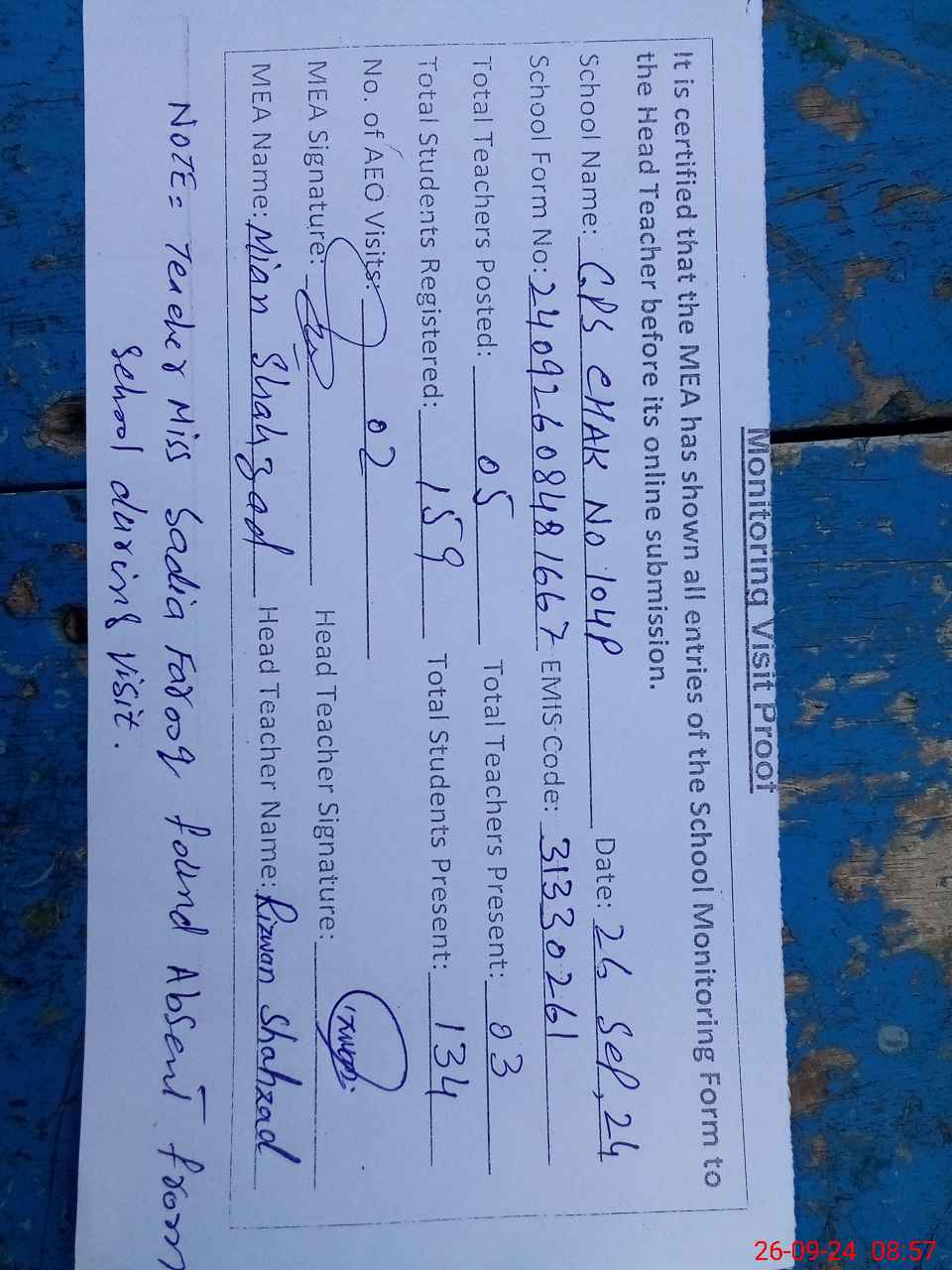 | Attendance Register | Head Teacher | MEA with School | Visit Proof |