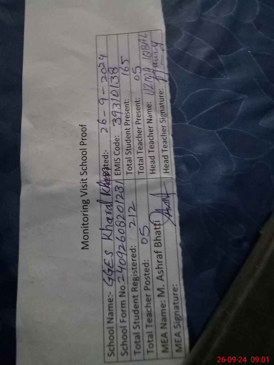| Name: Uz**** Iq**** Designation: (School Headmaster's/Headmistress's) Sst Phone/Cell Number: 03**** |