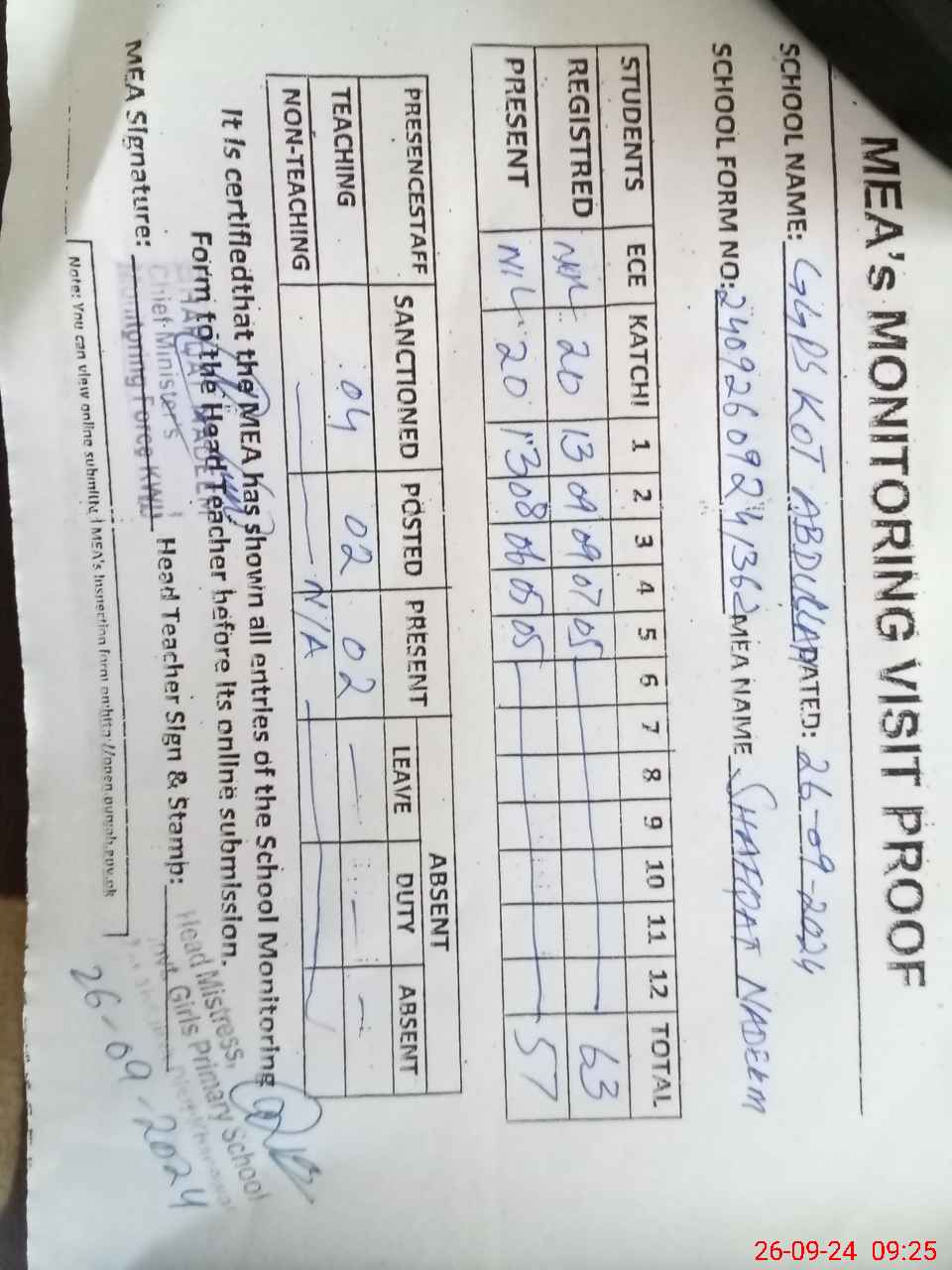 | Attendance Register | Head Teacher | MEA with School | Visit Proof |