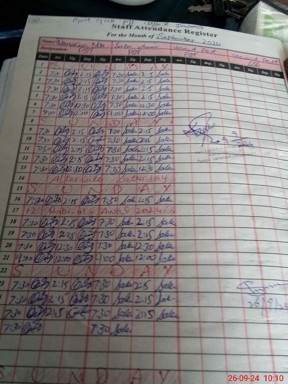 | Monitoring Date: 26-09-2024 | Start Time: 26-09-2024 09:43 AM | End Time: 26-09-2024 10:30 AM | Name of MEA: M.Is**** (S**** 03**** | |