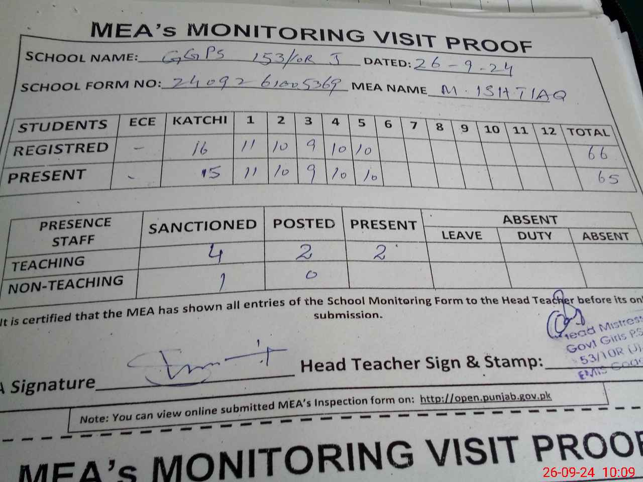 | Attendance Register | Head Teacher | MEA with School | Visit Proof |