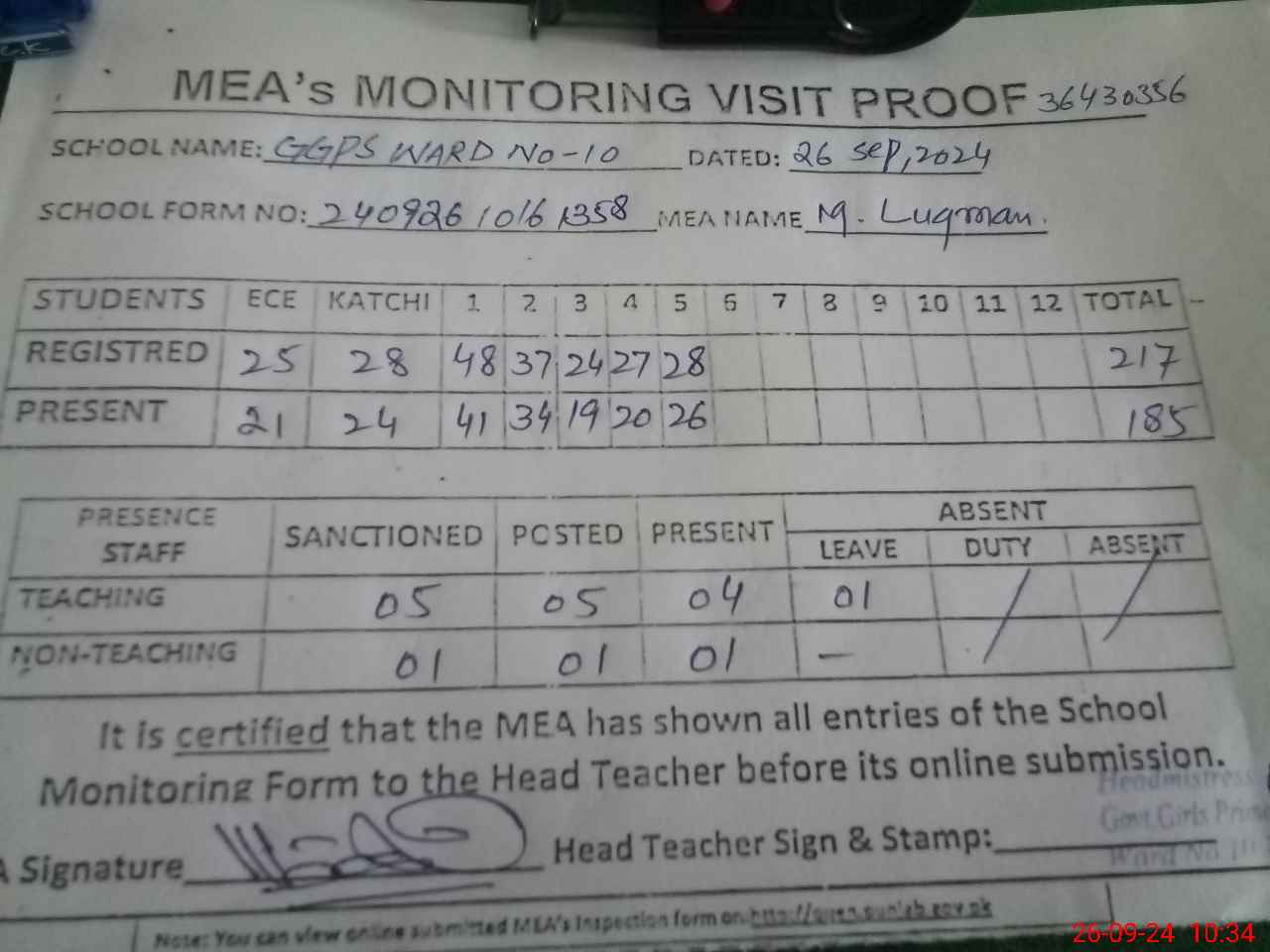| Attendance Register | Head Teacher | MEA with School | Visit Proof |