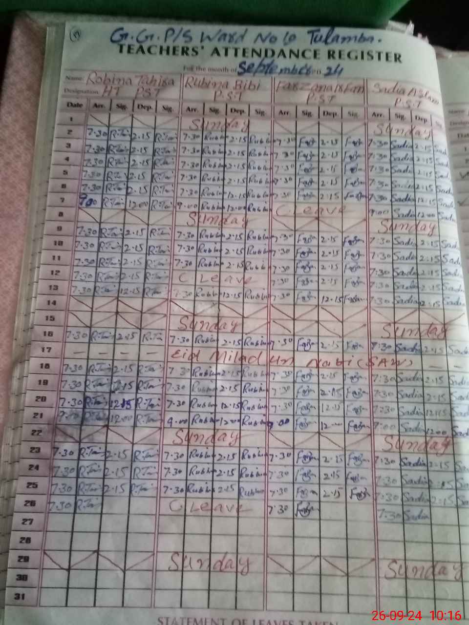 | Leave | Duty | Absent | Maternity | Medical | Ex- Pak |