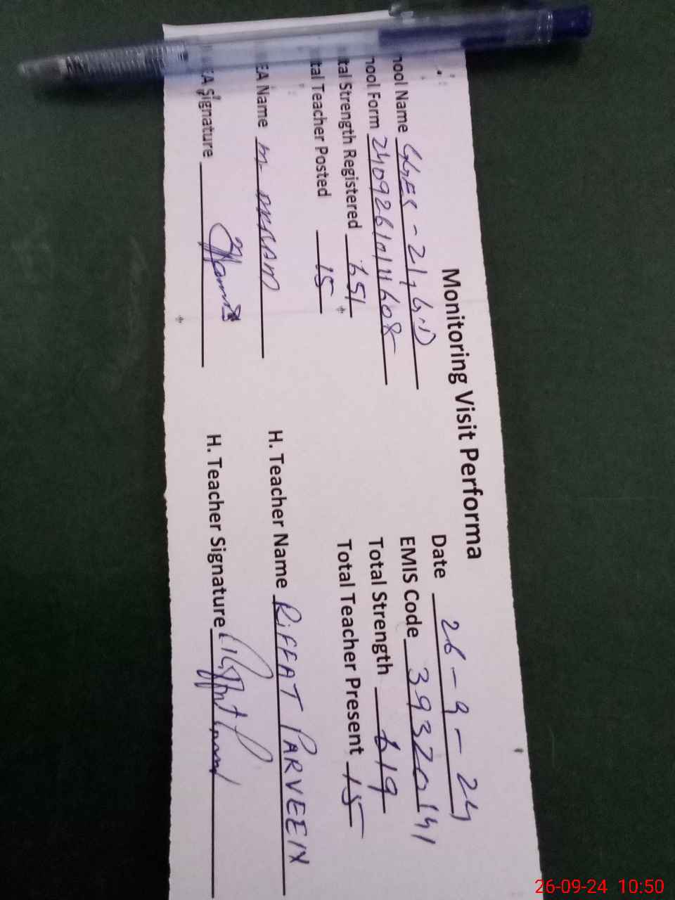 | Attendance Register | Head Teacher | MEA with School | Visit Proof |