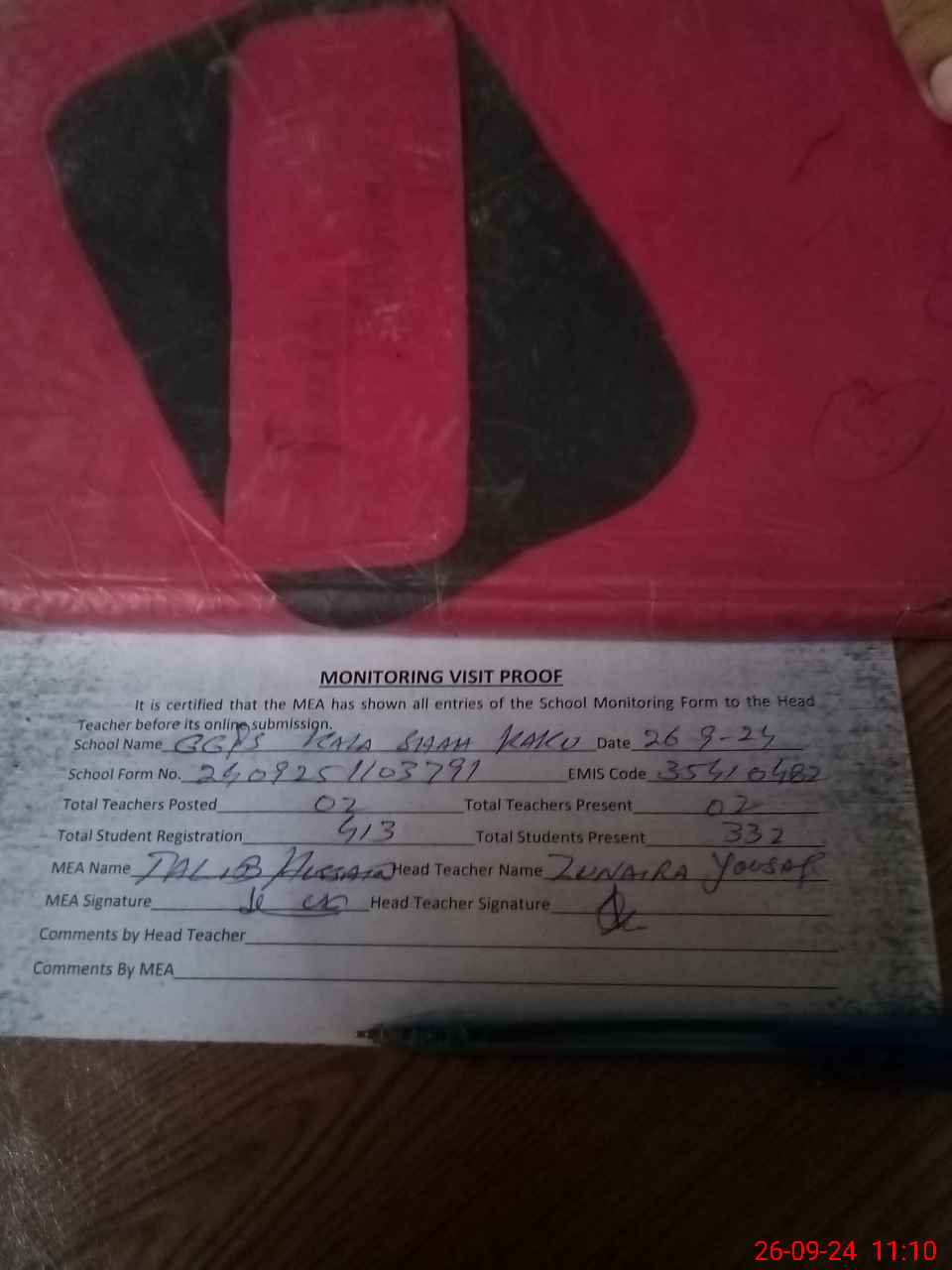 | Attendance Register | Head Teacher | MEA with School | Visit Proof |