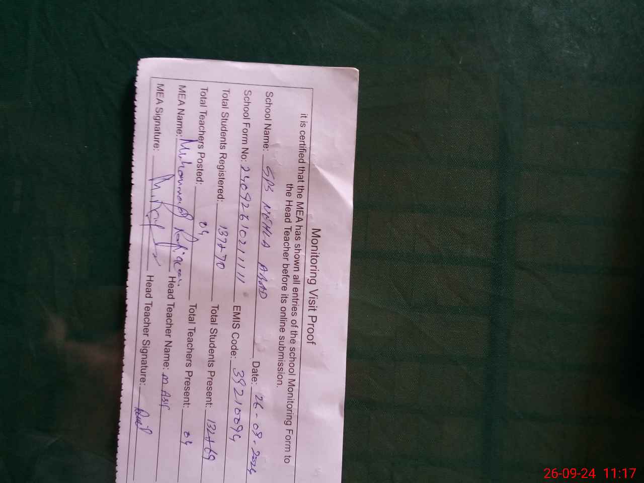 | Attendance Register | Head Teacher | MEA with School | Visit Proof |