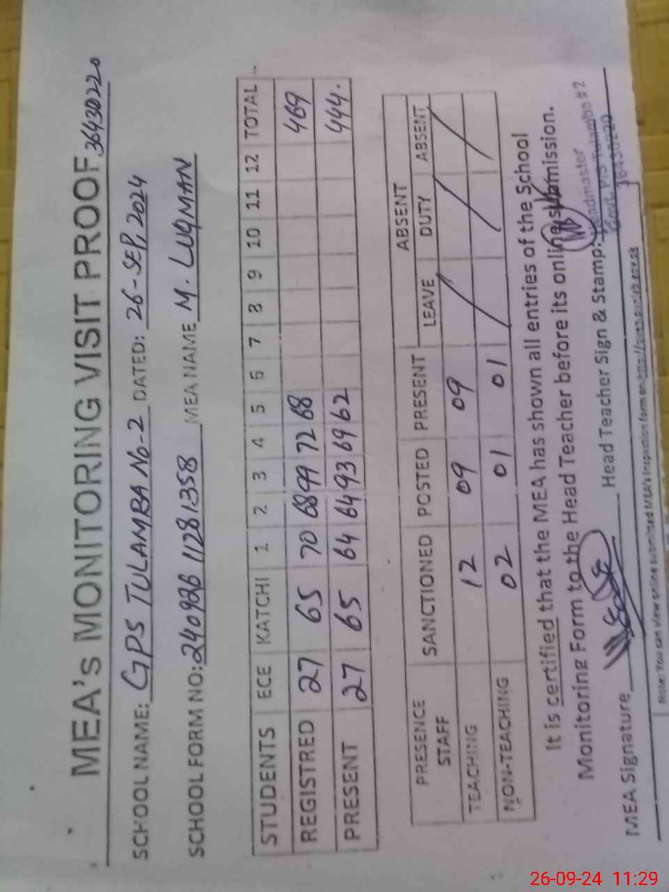 | Attendance Register | Head Teacher | MEA with School | Visit Proof |