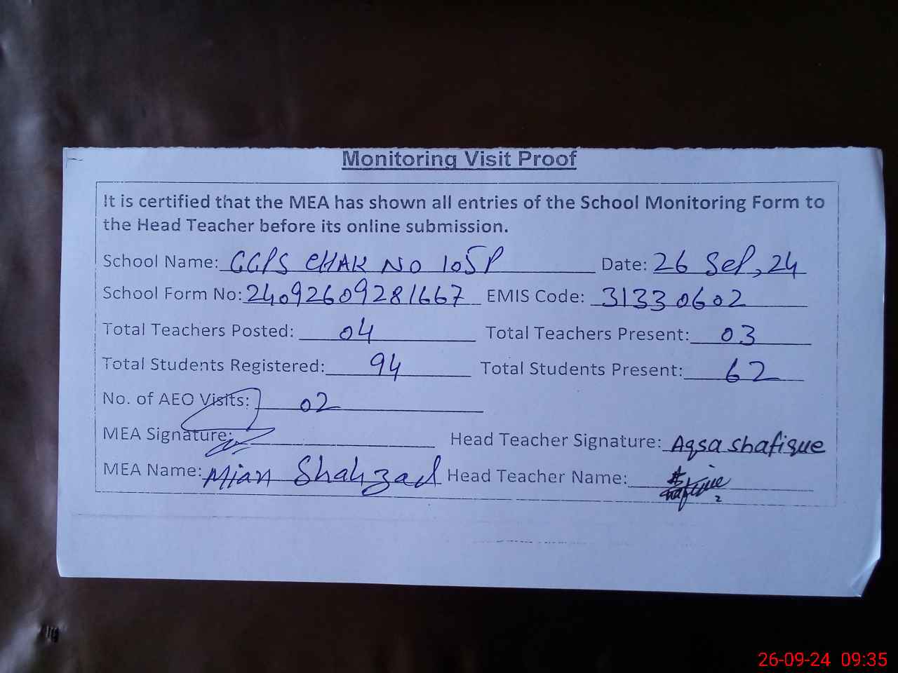 | EMIS Code: 31330602 | Name of School: GGPS CHAK NO. 105/P | |||
