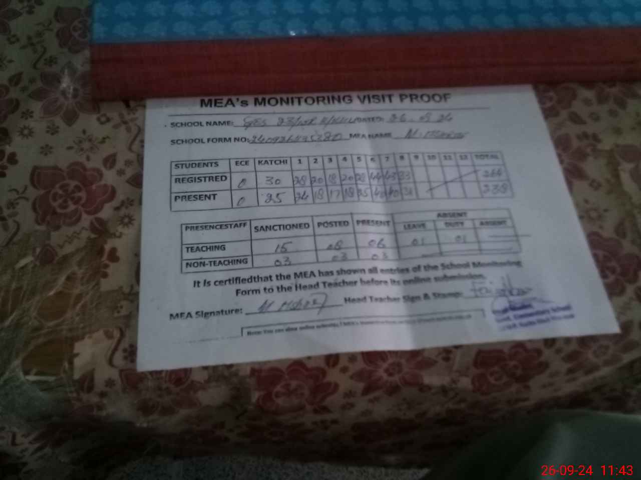 | Attendance Register | Head Teacher | MEA with School | Visit Proof |