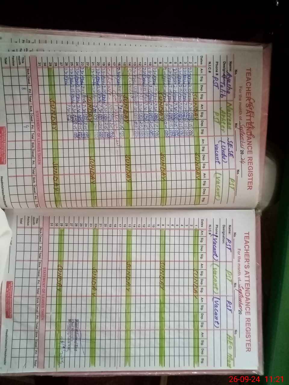 | Leave | Duty | Absent | Maternity | Medical | Ex- Pak |