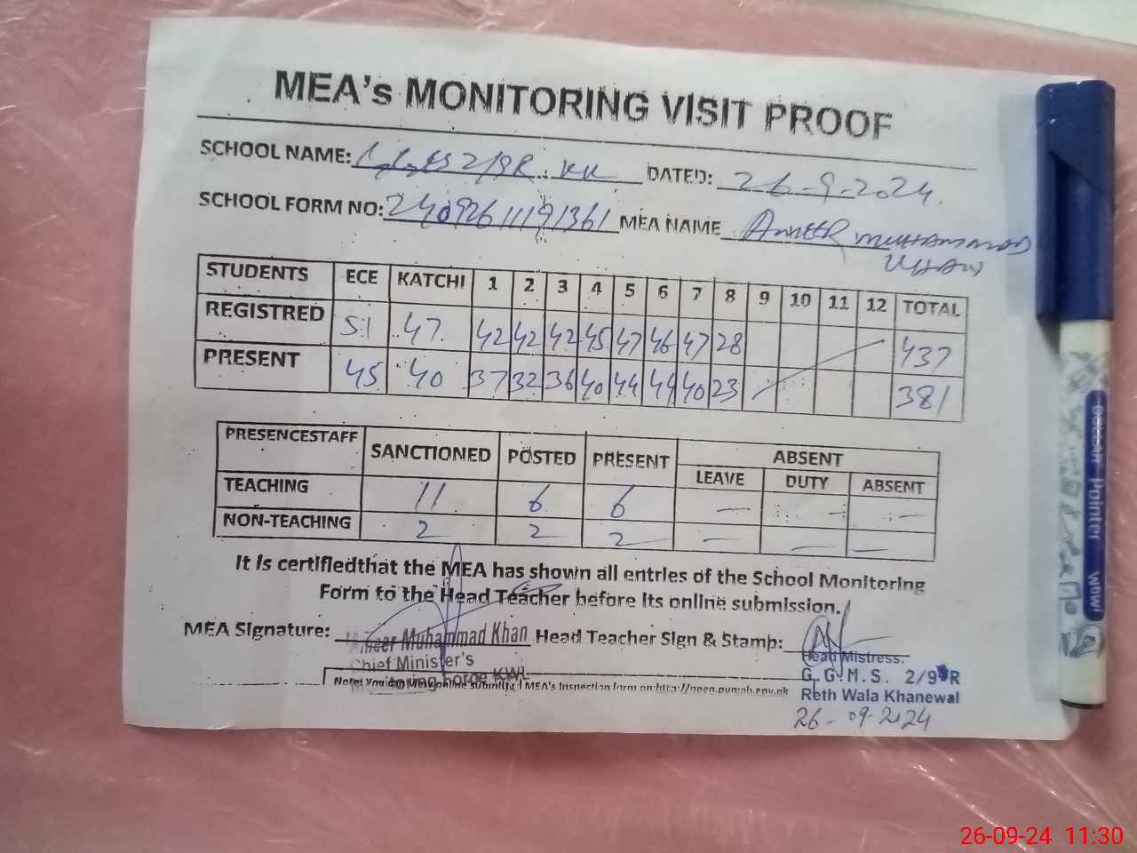 | Attendance Register | Head Teacher | MEA with School | Visit Proof |