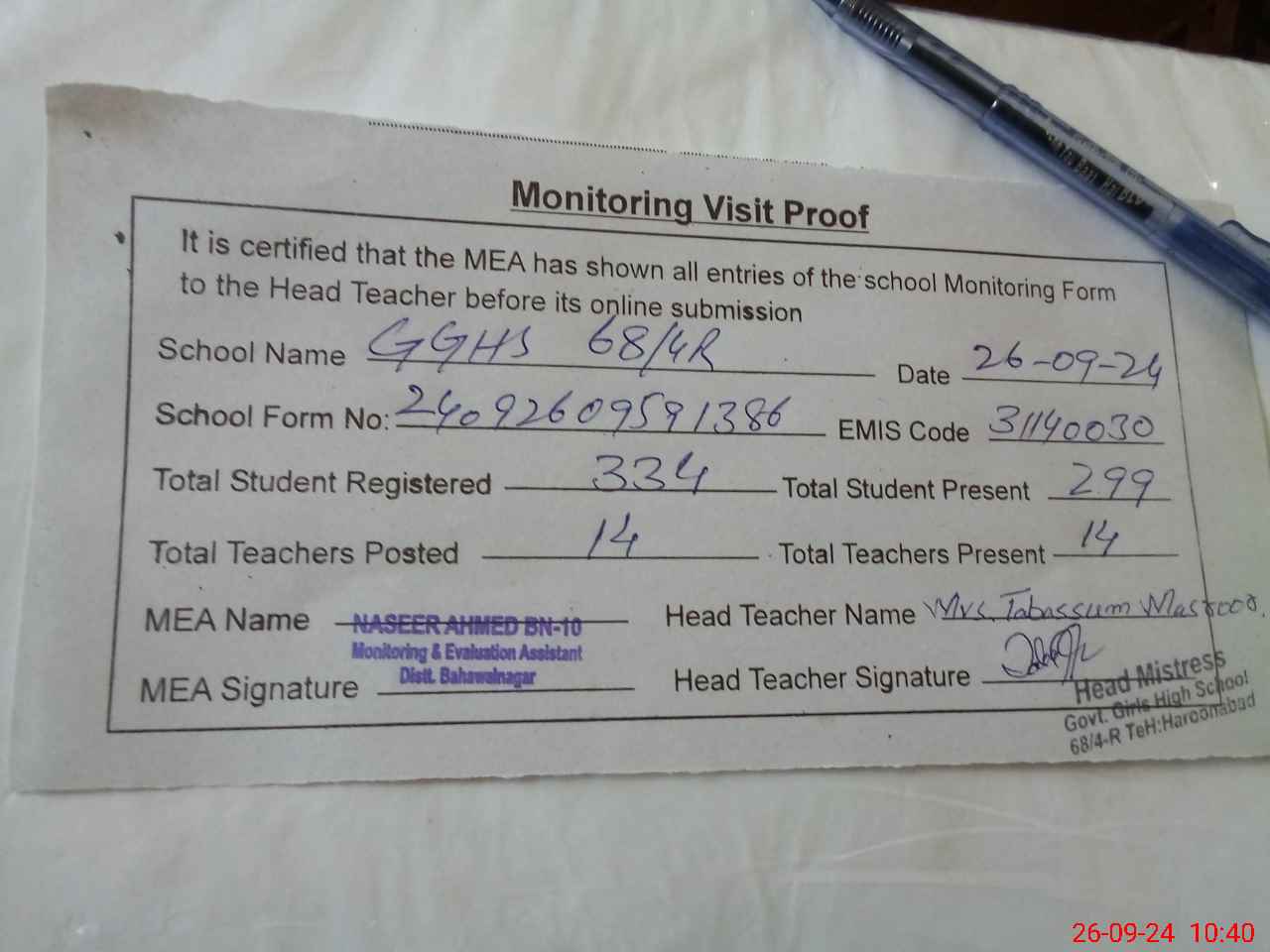 | Certified that this School was Inspected by the Undersigned MEA/DMO Today and the Information Stated Above is as Per Record. | |||||