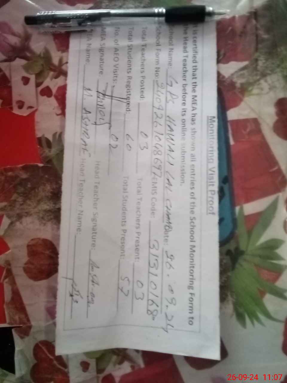 | Attendance Register | Head Teacher | MEA with School | Visit Proof |