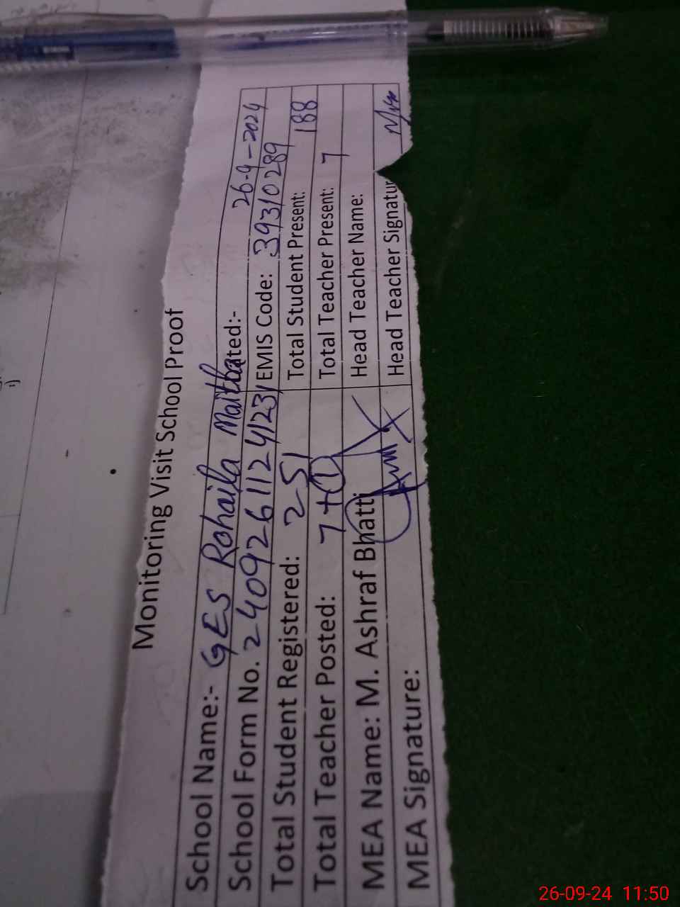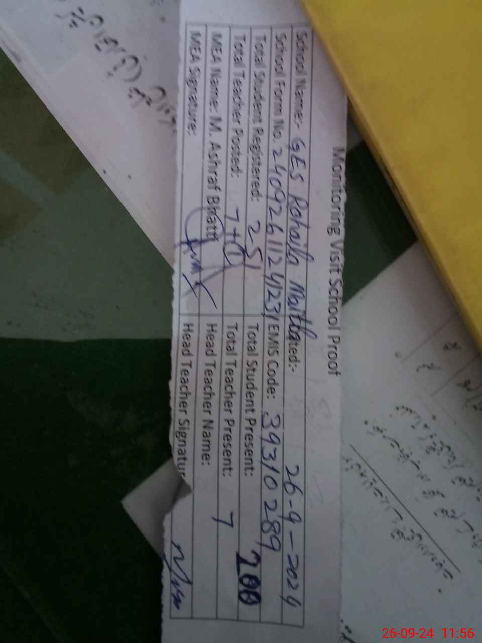 | Attendance Register | Head Teacher | MEA with School | Visit Proof |
