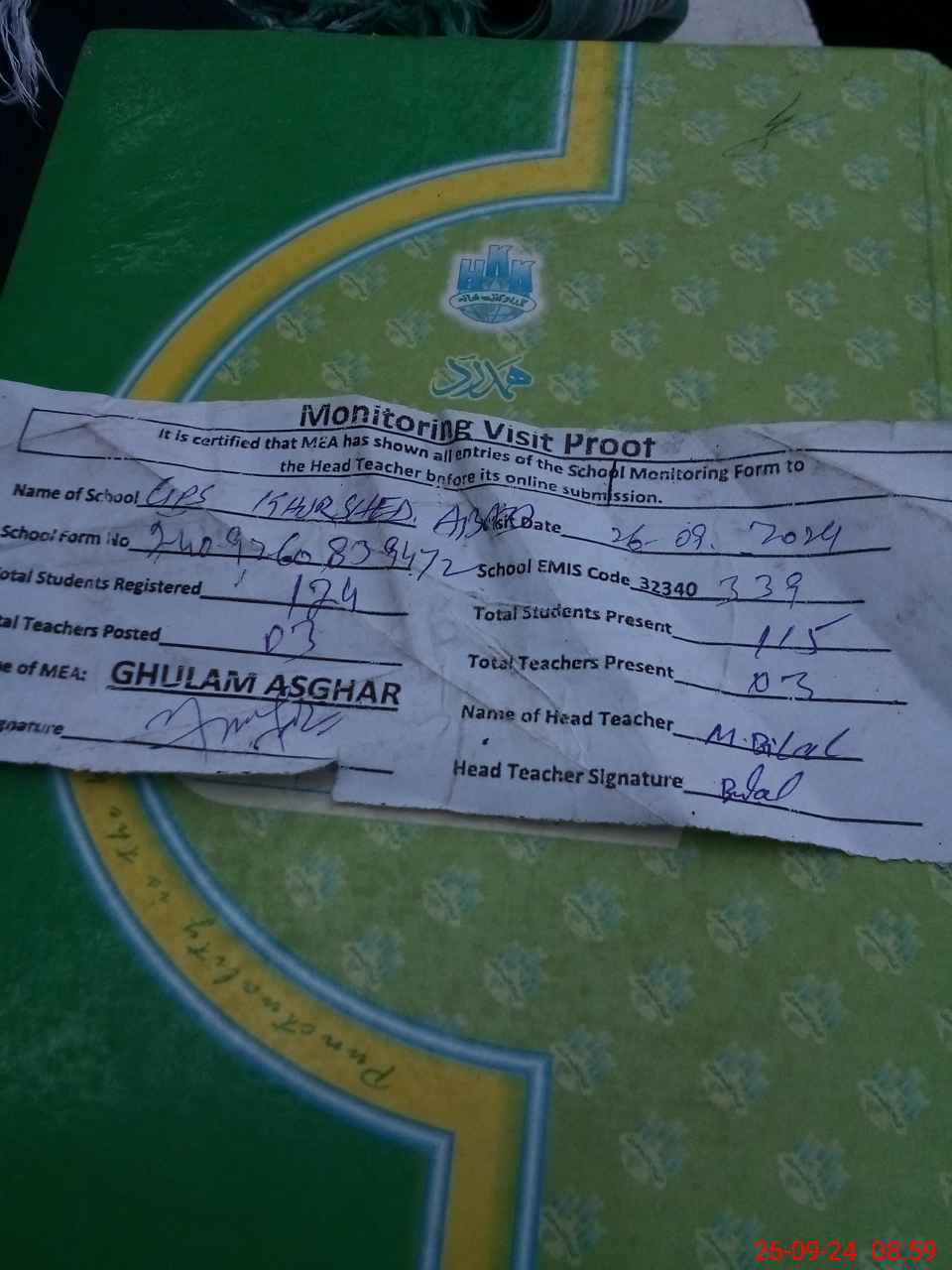 | Attendance Register | Head Teacher | MEA with School | Visit Proof |
