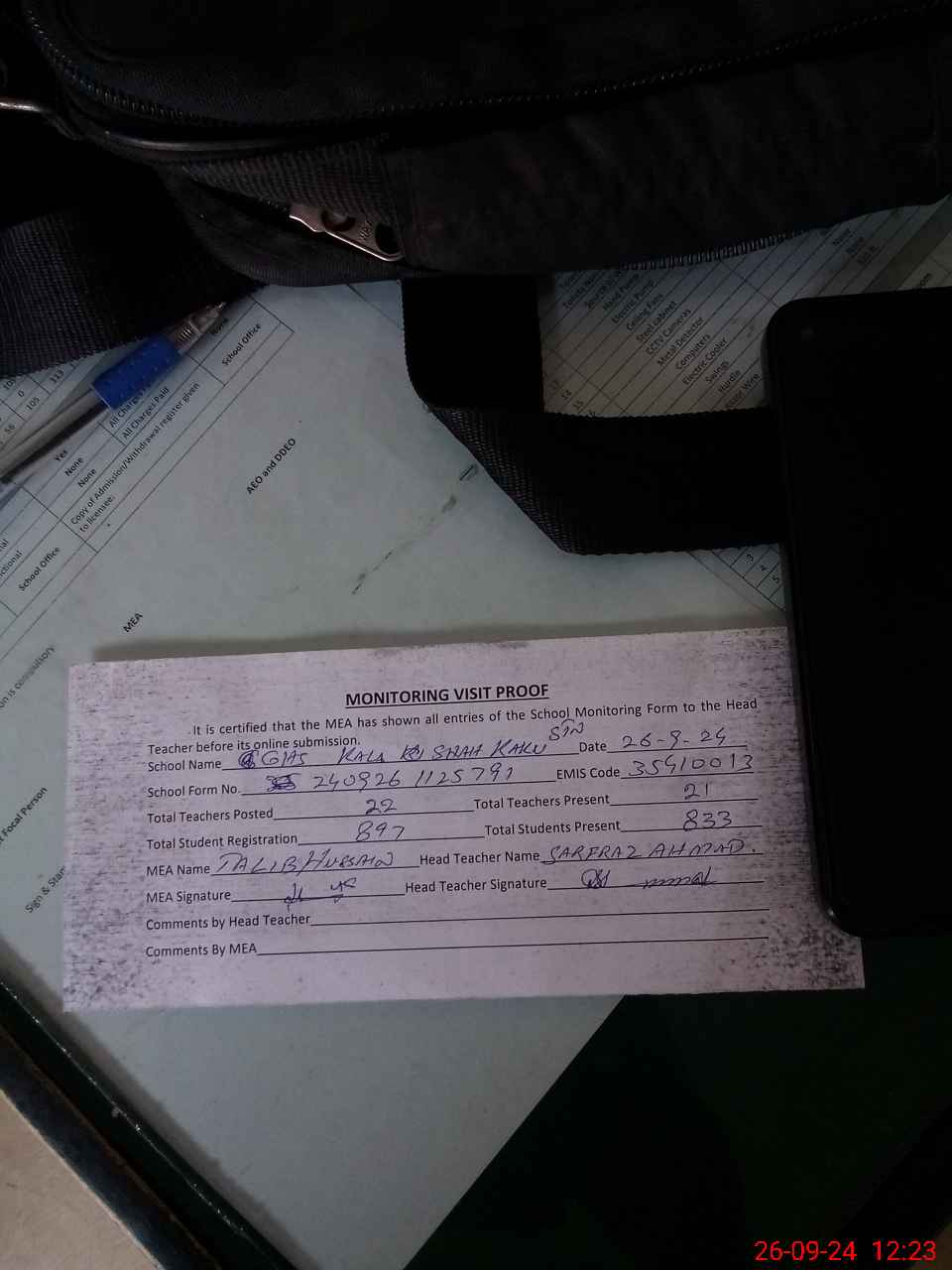 | Attendance Register | Head Teacher | MEA with School | Visit Proof |
