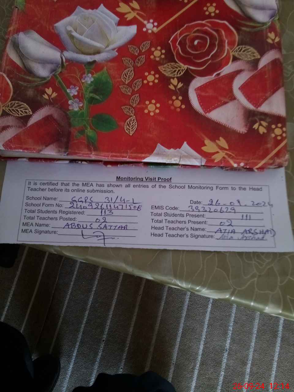 | Attendance Register | Head Teacher | MEA with School | Visit Proof |