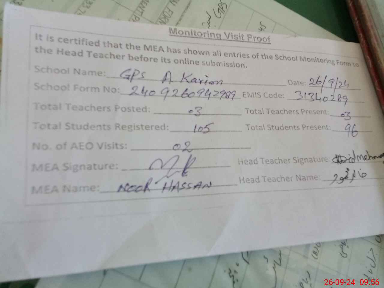 | Attendance Register | Head Teacher | MEA with School | Visit Proof |