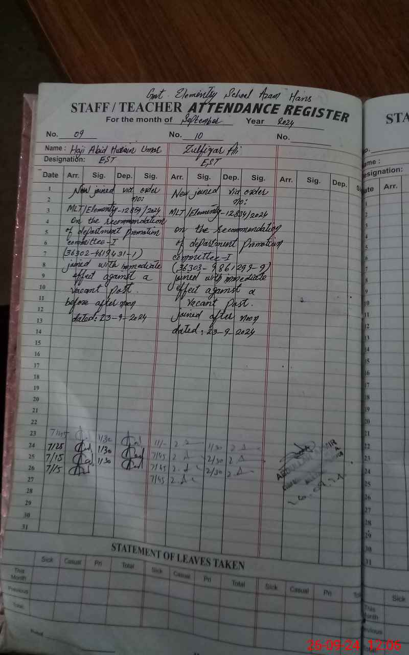 | Remarks (Use Separate Page if Required): Note Haji Abid Hussain Est Nic 3630246194311 join this School on 23rd Sep 2024 Vide oder no Mlt 12854 Dated 22sep 2024 And Zulifqar Ali nic 3630398612999 Est G join this School on 23rd Sep 2024 vide order no Mlt E 12834 Dated 22 sep2024 Sis data not up date of student Last clander month only one visit of Aeo | |||||