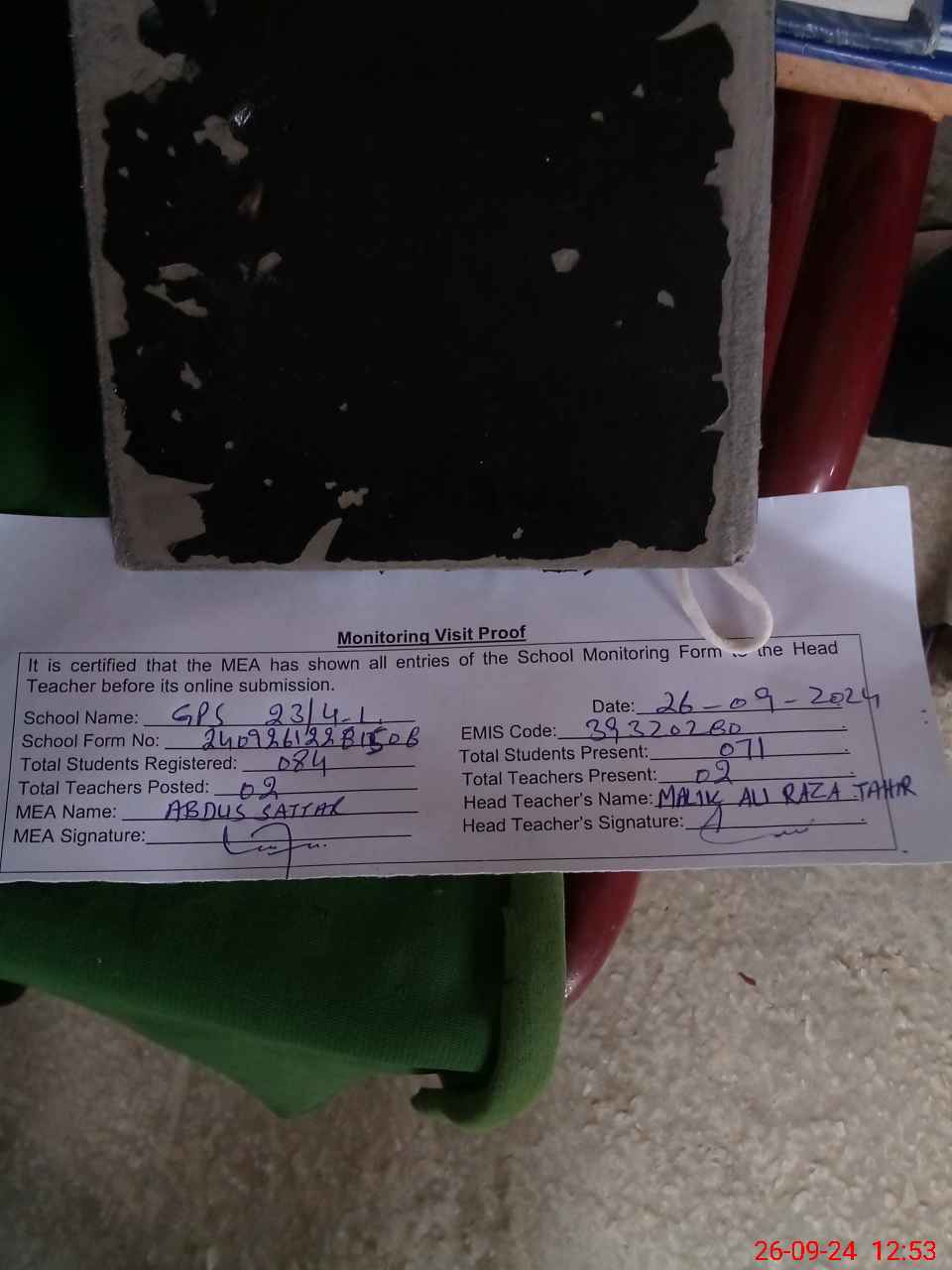 | Attendance Register | Head Teacher | MEA with School | Visit Proof |