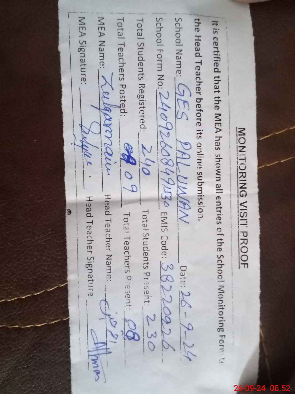 | Attendance Register | Head Teacher | MEA with School | Visit Proof |