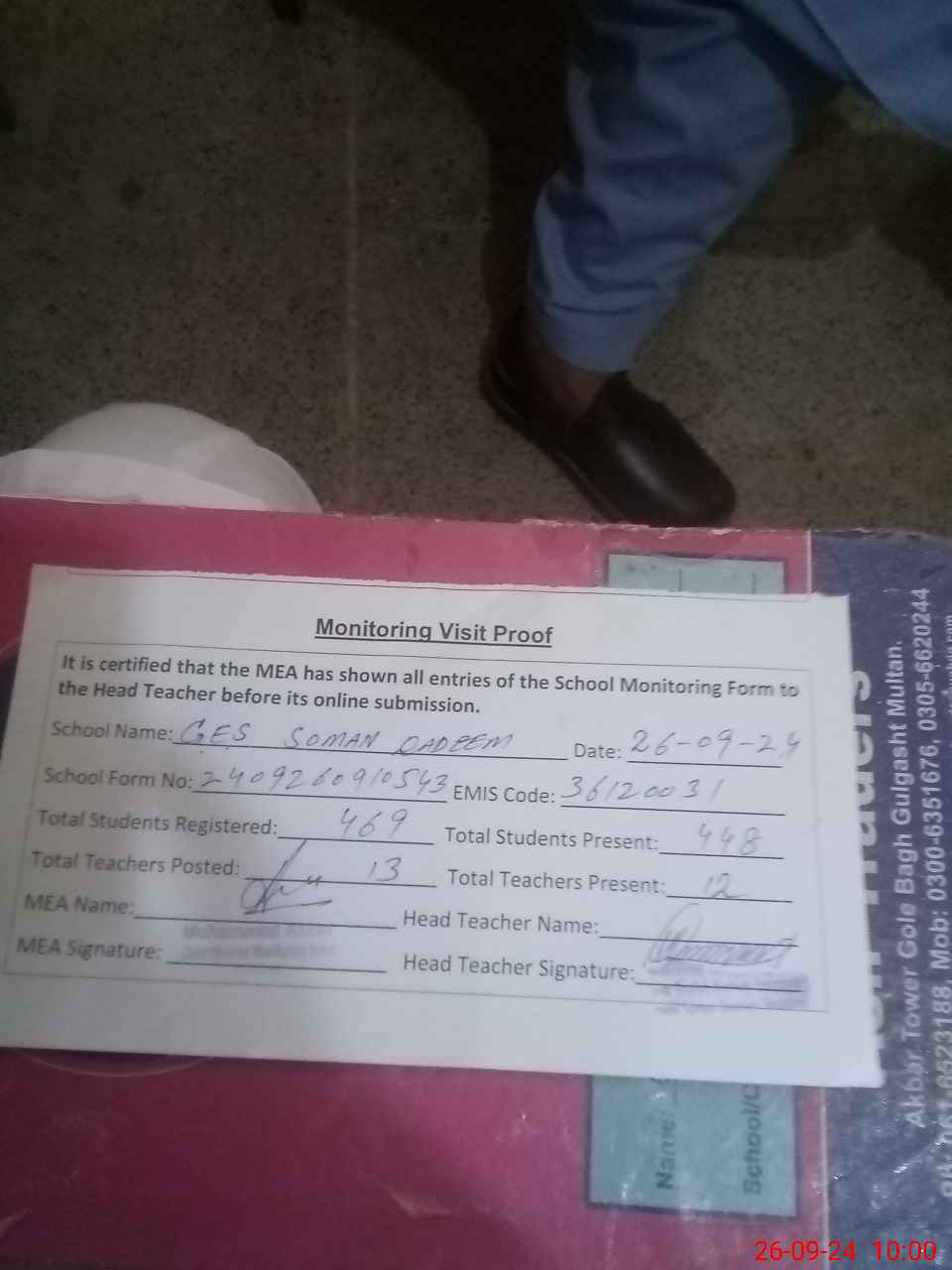 | Attendance Register | Head Teacher | MEA with School | Visit Proof |