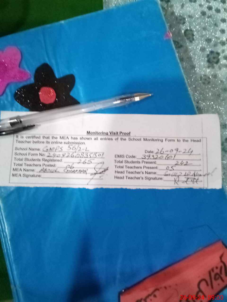 | Attendance Register | Head Teacher | MEA with School | Visit Proof |