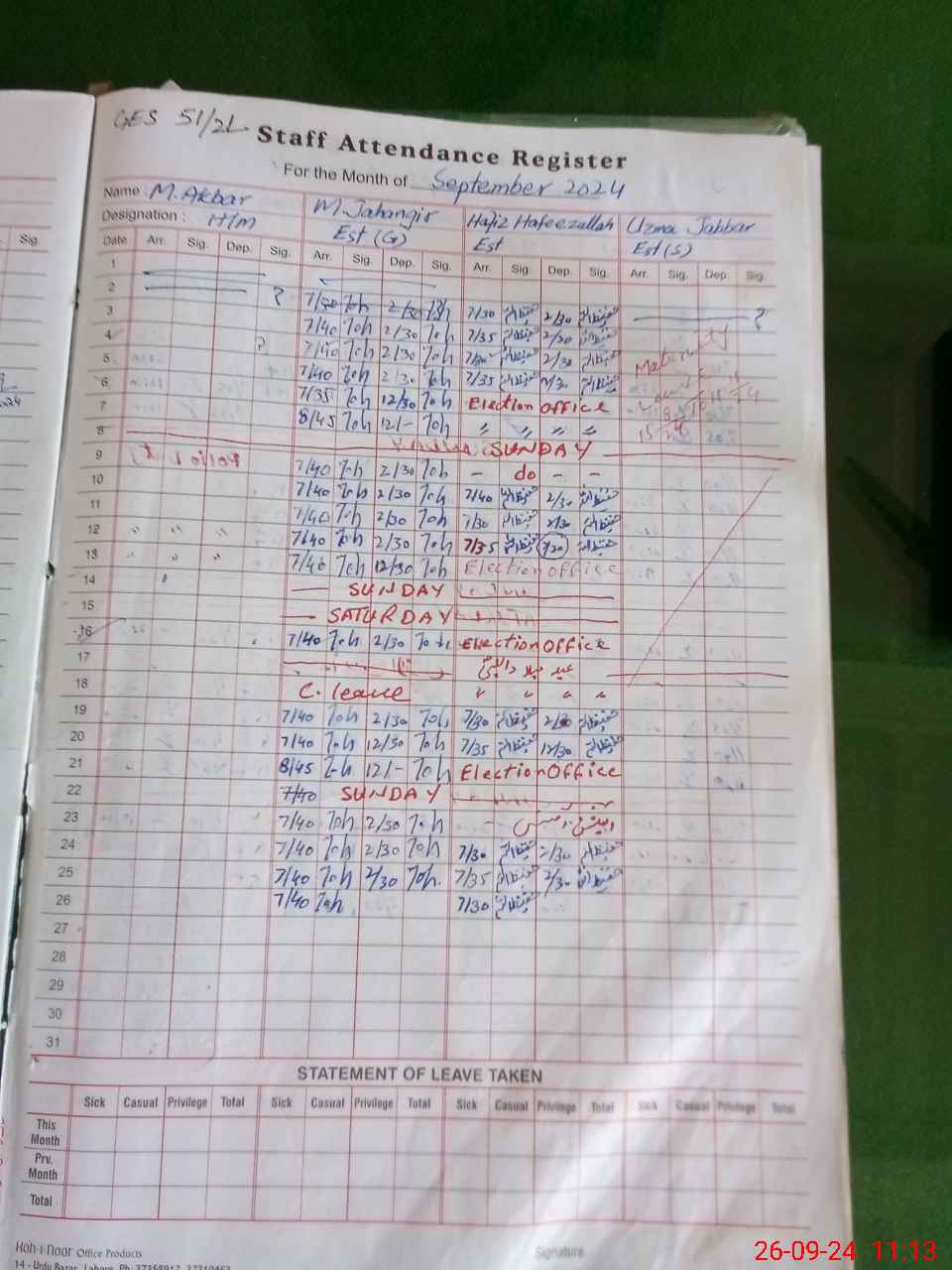 | Remarks (Use Separate Page if Required): 01 teacher named Hafiz Hafeezullah is on official duty with Election Commission from 1030 hrs on 26sep2024 | |||||