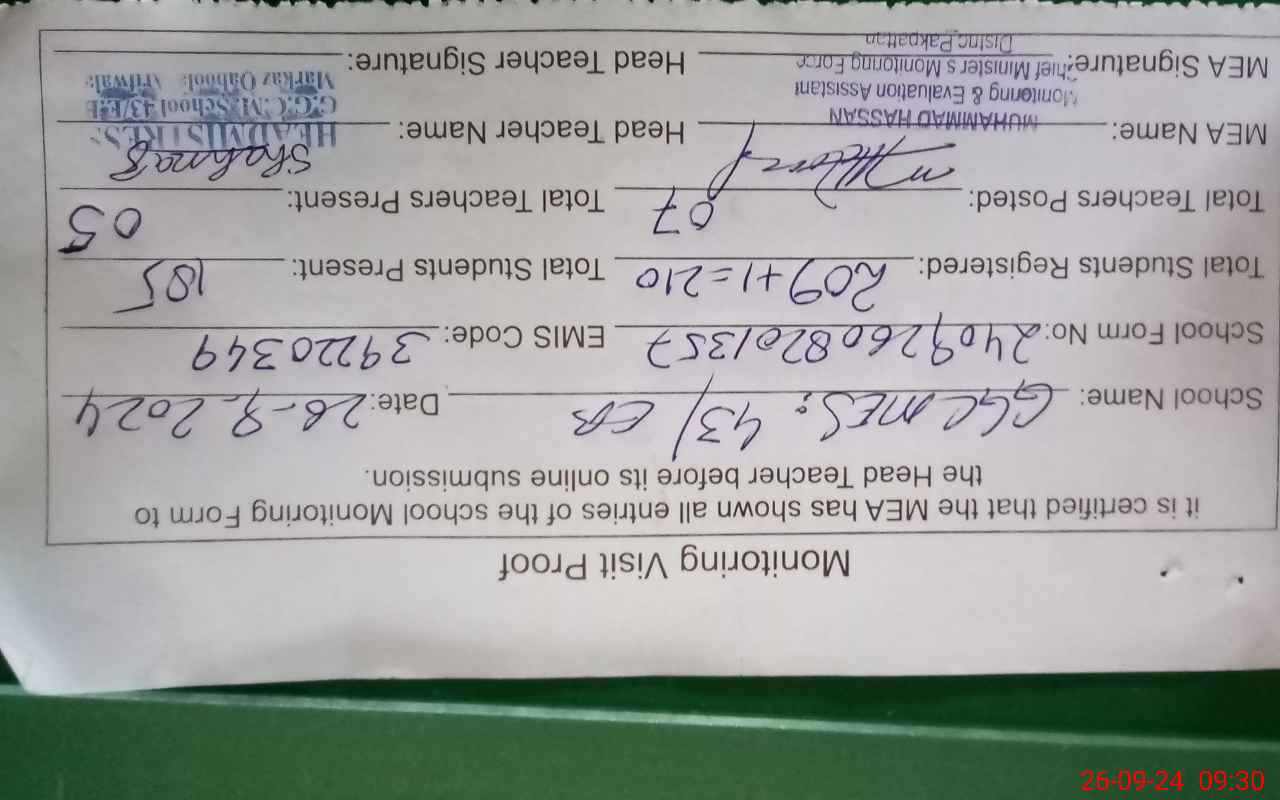 | EMIS Code: 39220349 | Name of School: GGCMES 43 EB P/O KOT KHUDA BUKHSH | |||