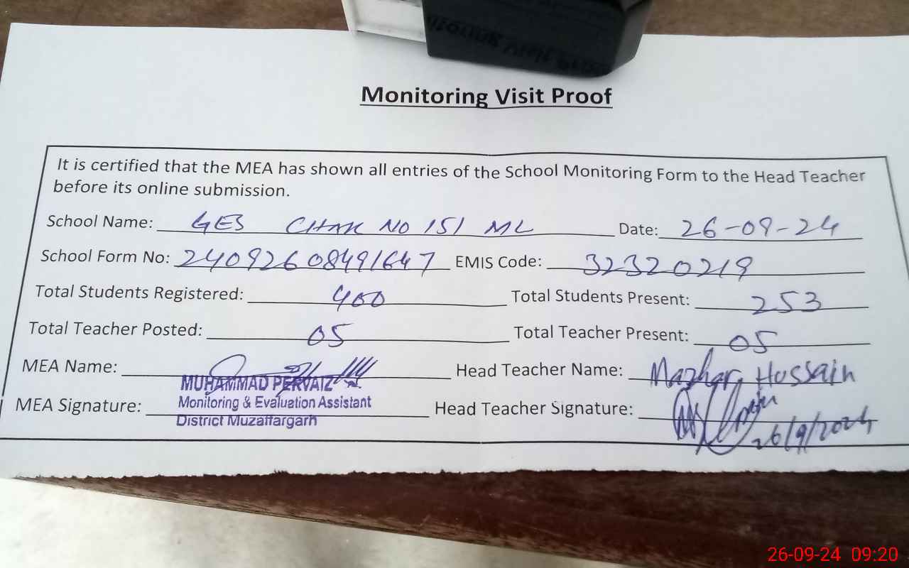| EMIS Code: 32320219 | Name of School: GES CHAK NO. 151/ML | |||
