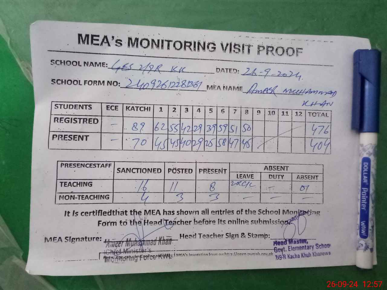 | Attendance Register | Head Teacher | MEA with School | Visit Proof |