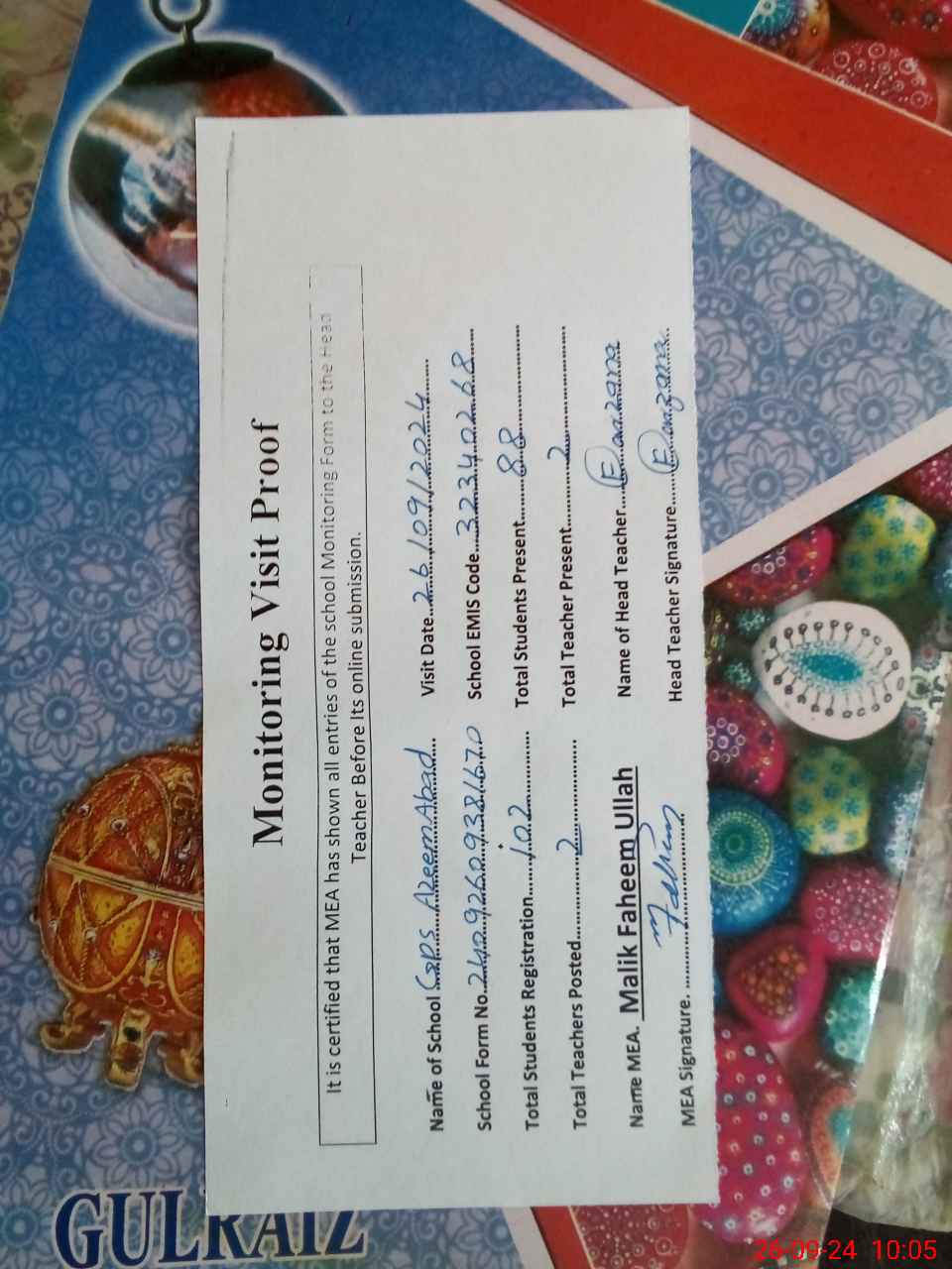 | Attendance Register | Head Teacher | MEA with School | Visit Proof |
