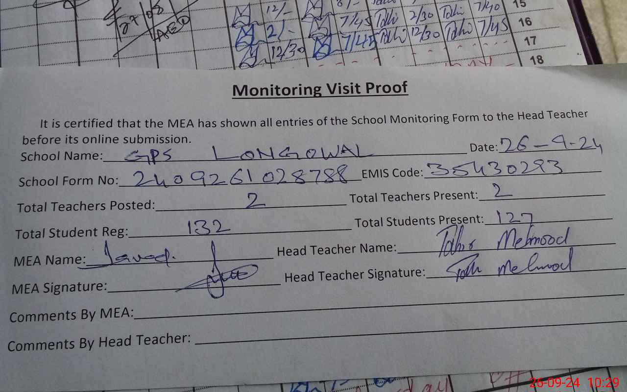 | Attendance Register | Head Teacher | MEA with School | Visit Proof |