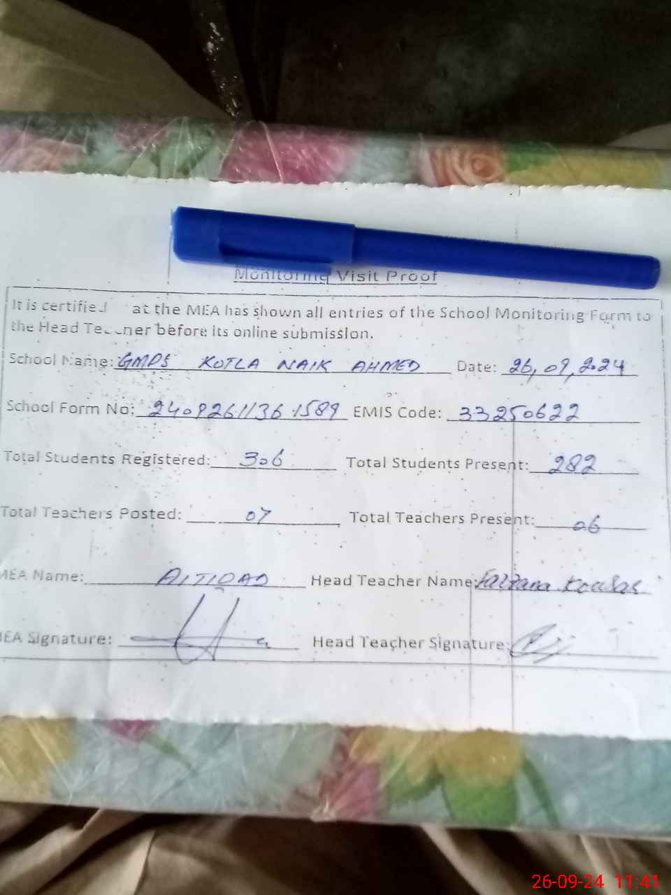 | Attendance Register | Head Teacher | MEA with School | Visit Proof |