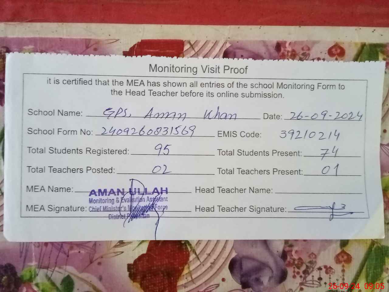 | EMIS Code: 39210214 | Name of School: GPS AMAN KHAN | |||