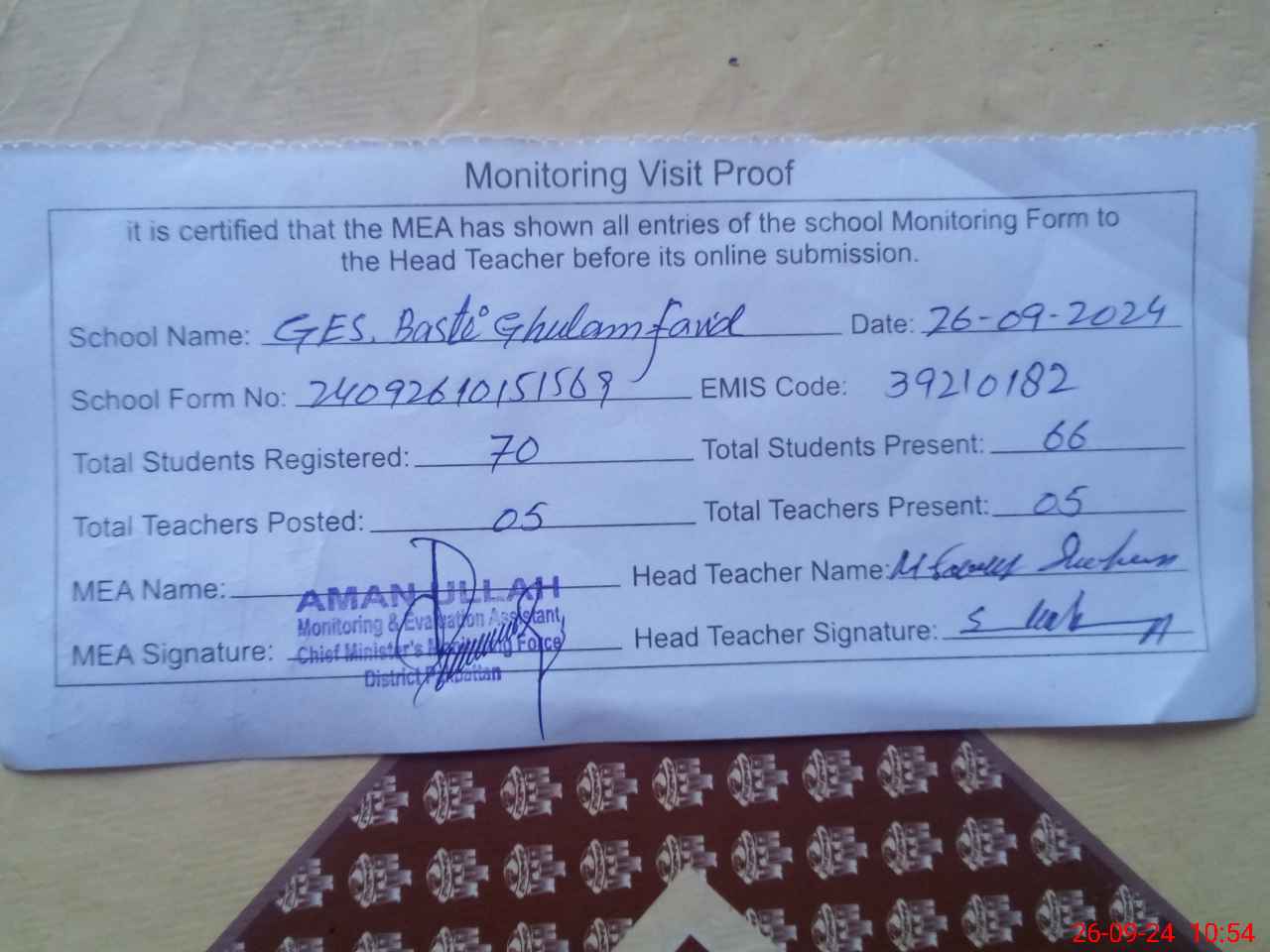 | EMIS Code: 39210182 | Name of School: GES BASTI GHULAM FARID | |||