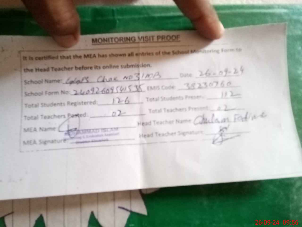 | Attendance Register | Head Teacher | MEA with School | Visit Proof |