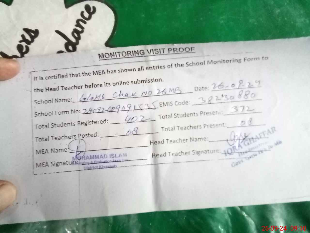 | Attendance Register | Head Teacher | MEA with School | Visit Proof |