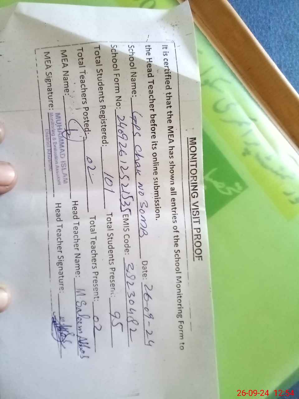 | EMIS Code: 38230482 | Name of School: GPS CHAK NO. 30 MB | |||