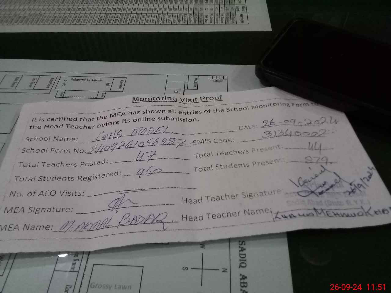 | Attendance Register | Head Teacher | MEA with School | Visit Proof |