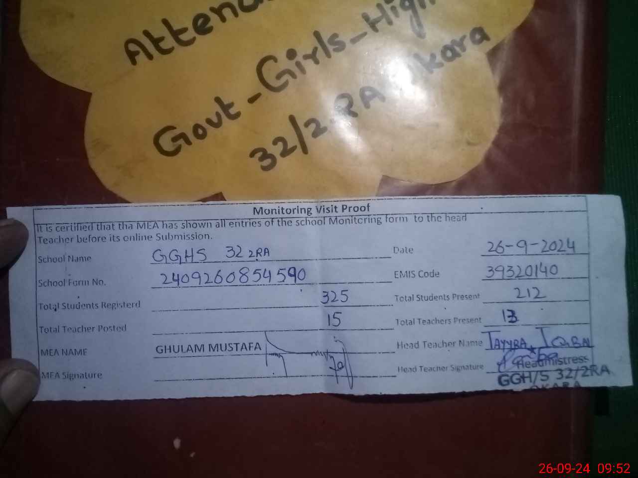 | Attendance Register | Head Teacher | MEA with School | Visit Proof |