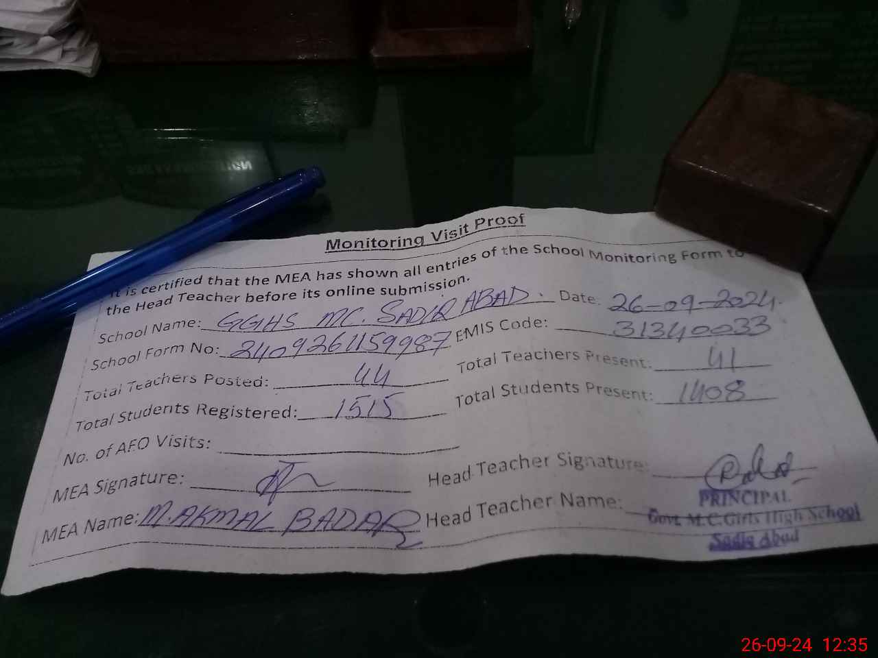 | Certified that this School was Inspected by the Undersigned MEA/DMO Today and the Information Stated Above is as Per Record. | |||||