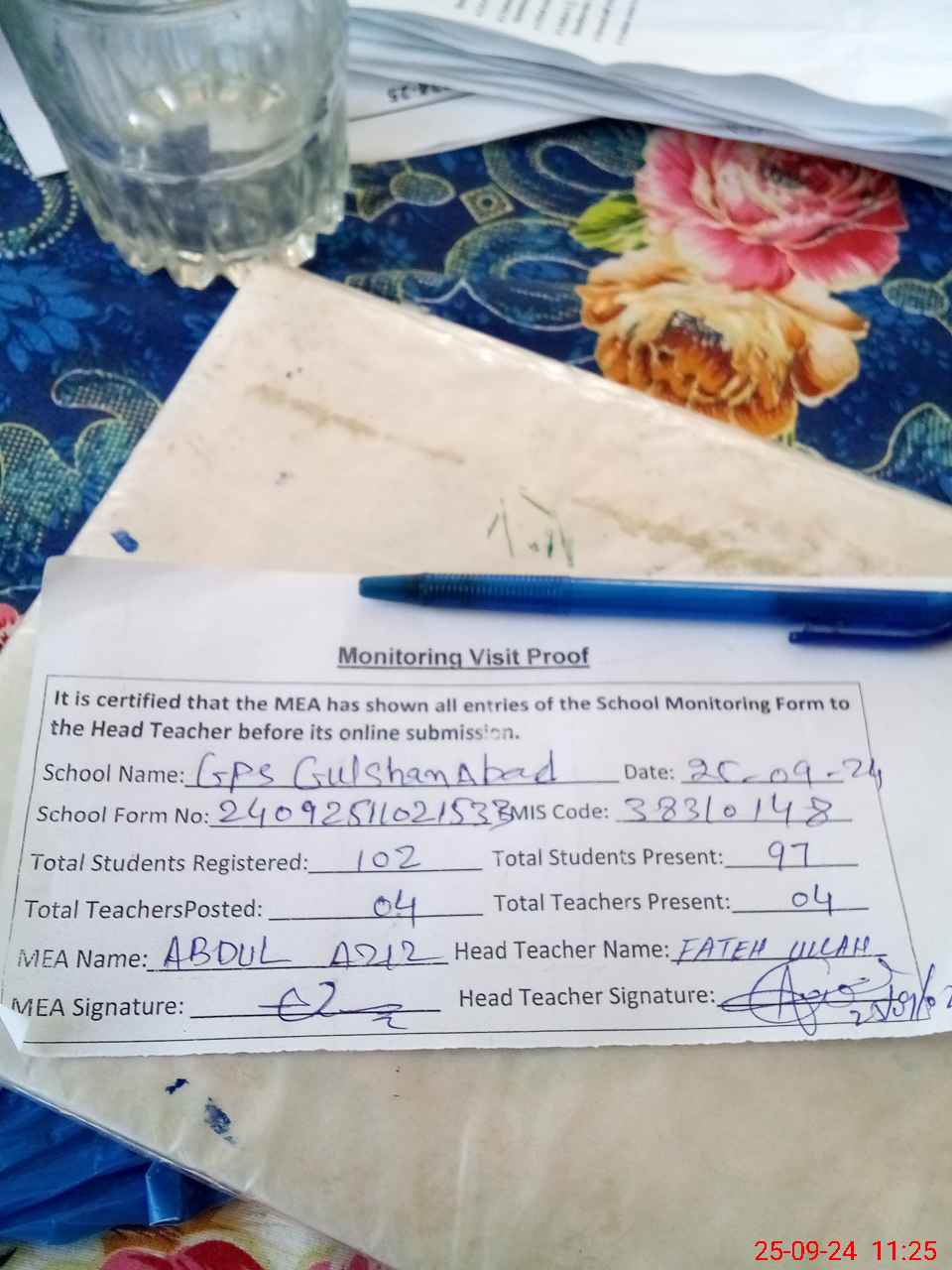 | Attendance Register | Head Teacher | MEA with School | Visit Proof |