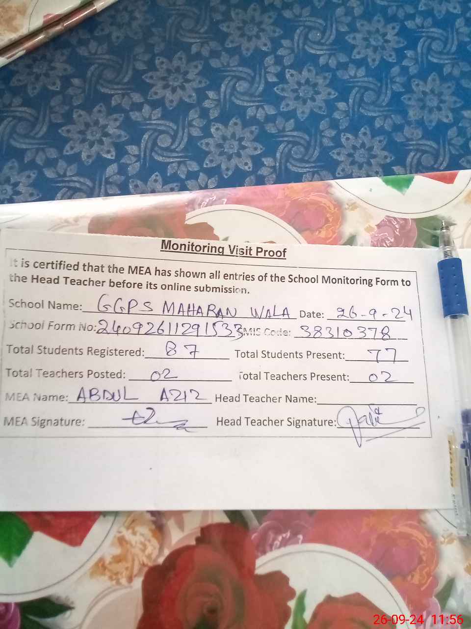 | Attendance Register | Head Teacher | MEA with School | Visit Proof |
